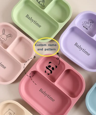 Spill-Proof 3-Section Suction Plate | Custom Name & Fun Cartoon Designs for Toddlers baby silicone square plate